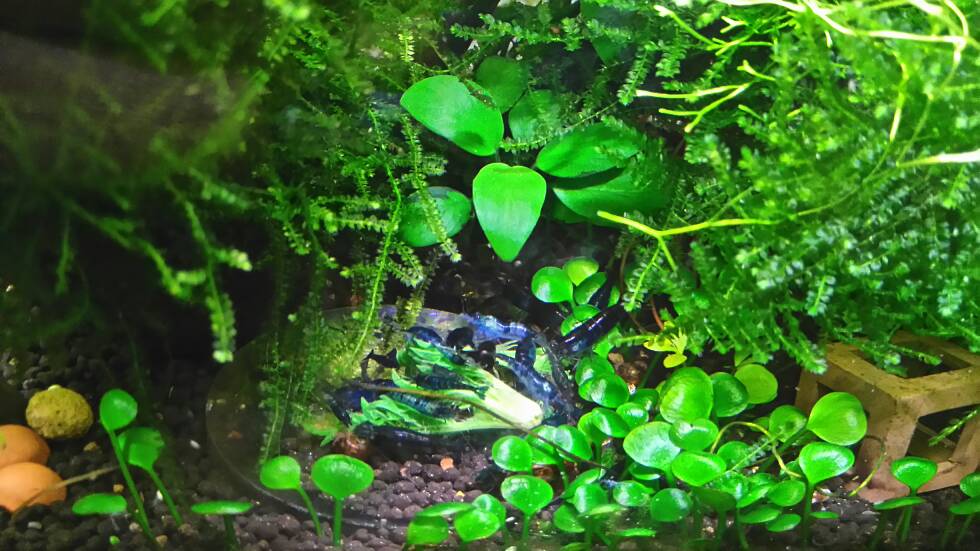 Malé krevetky už vidím pobehovať,ale zdá sa mi ich málo,ale v tých machoch ich môže byť ešte pár..Pár dní ďalšia samička nosí,naozaj krásne modrá.Už ale vidím dosť kúskov(možno iba sumcov)čo nemajú peknú farbu.Priesvitná modrá a miestami čierna. (nie sú vôbec pekné)