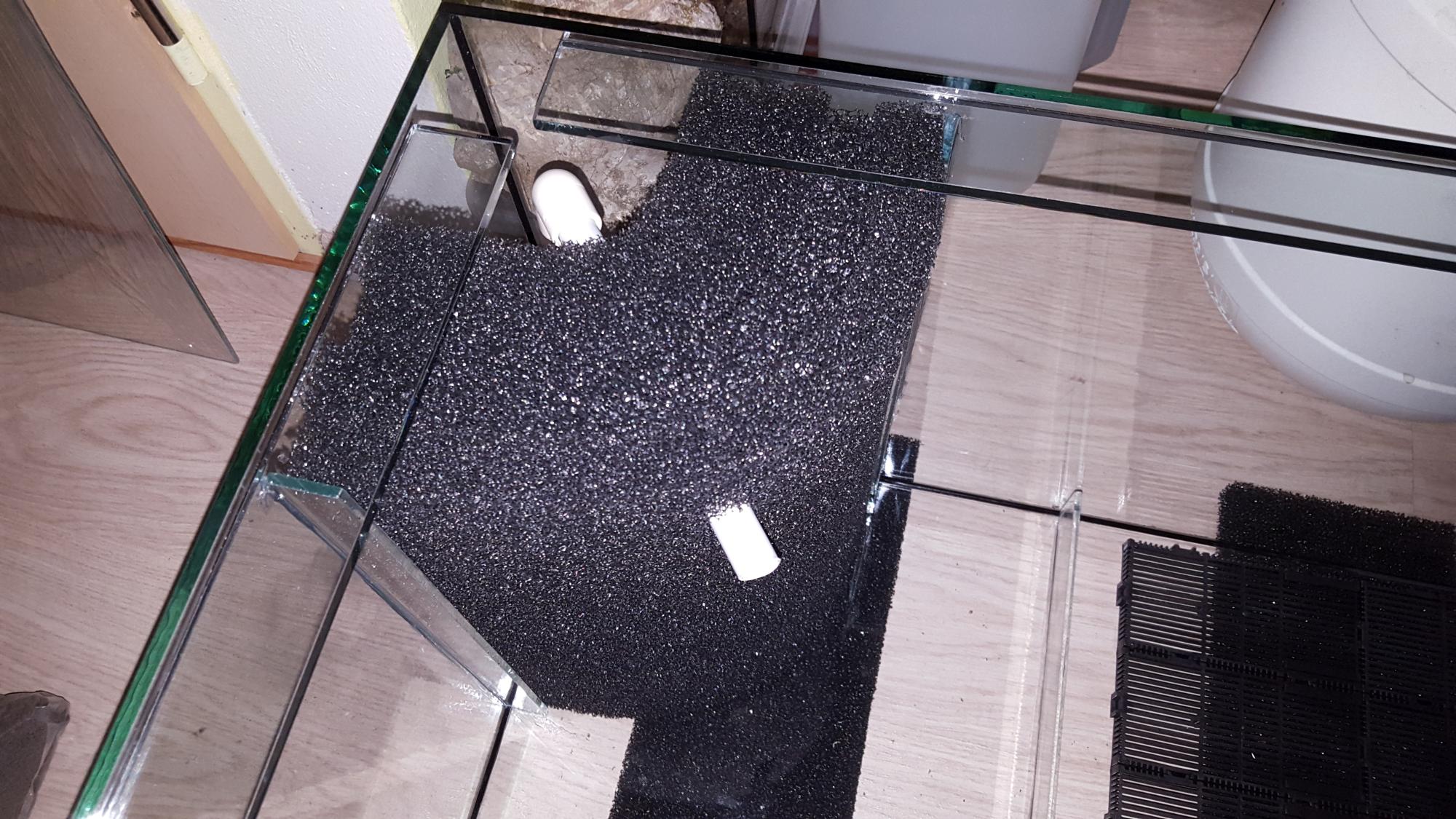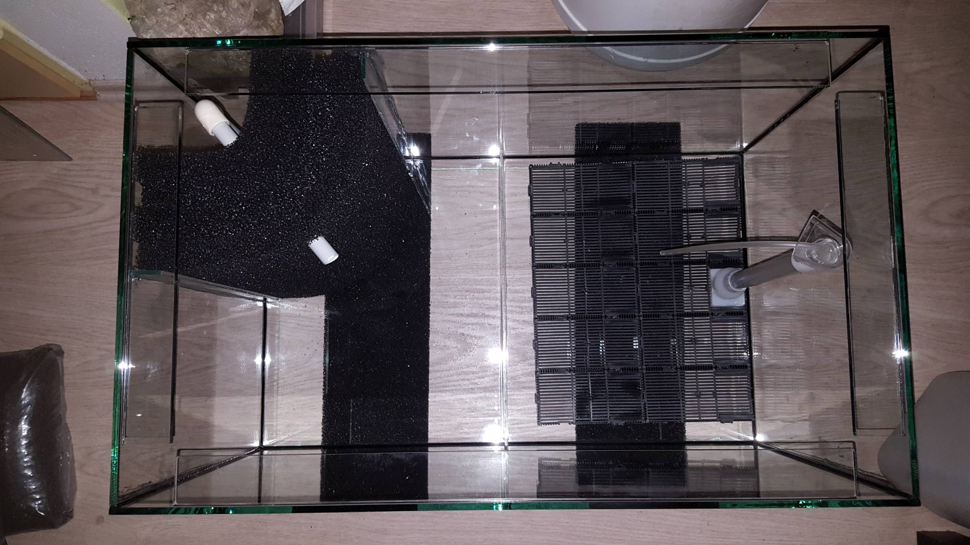 Filter: z jednej strany Hamburský rohový cca 10 litrov molitanu a z druhej strany pôdny rozkladajúci sa po cca polovici dna. Oba poháňané vzduchom.