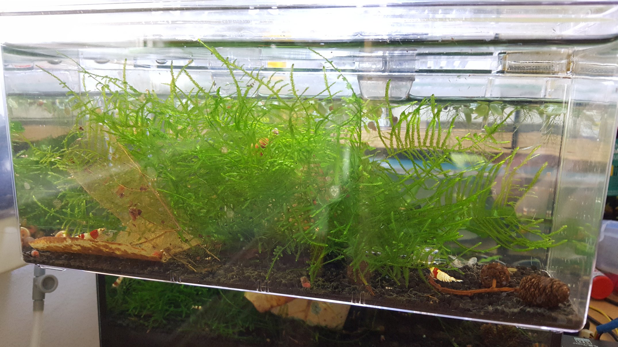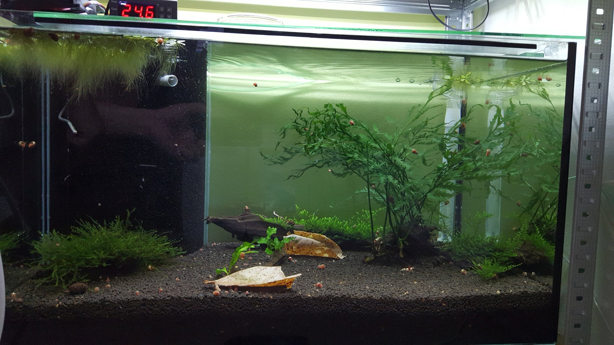 Caute tak trochu nestiham ale tu je aspon cosi - akva je zabehnuté prví 4 samci tam uz cca 2 tyzdne plavaju. Vo vnutri sa toho moc nezmenilo - pribudol Bolbithis a trosku Microsoria. Neplanujem davat tam toho viacej co sa rastlin tyka len necham rozrast sa to co tam je. Chystam sa este do Garnelaxie niekedy buduci mesiac takze pribudne este jeden oxydator a mozno cholla ak zozeniem lacnu. Celkovo z 11 donesenych Benibachi boli len 2 samicky a aj z toho mala som pri tych teplach o jednu prisiel. Druha ma za sebou uz dve znasky no prvych krpcov som pomiesal s hybridmi kedze neviem ktory samec ju naparil a tie idu bokom ale uz pri druhej znaske bola cielene naparena najlepsim samcom co mam a zatial tam vidim cca 20 krpcov co maju teraz zhruba 13 dni a holka prave nosi tretiu znasku vajiciek opät cielene od najlepsieho samca.