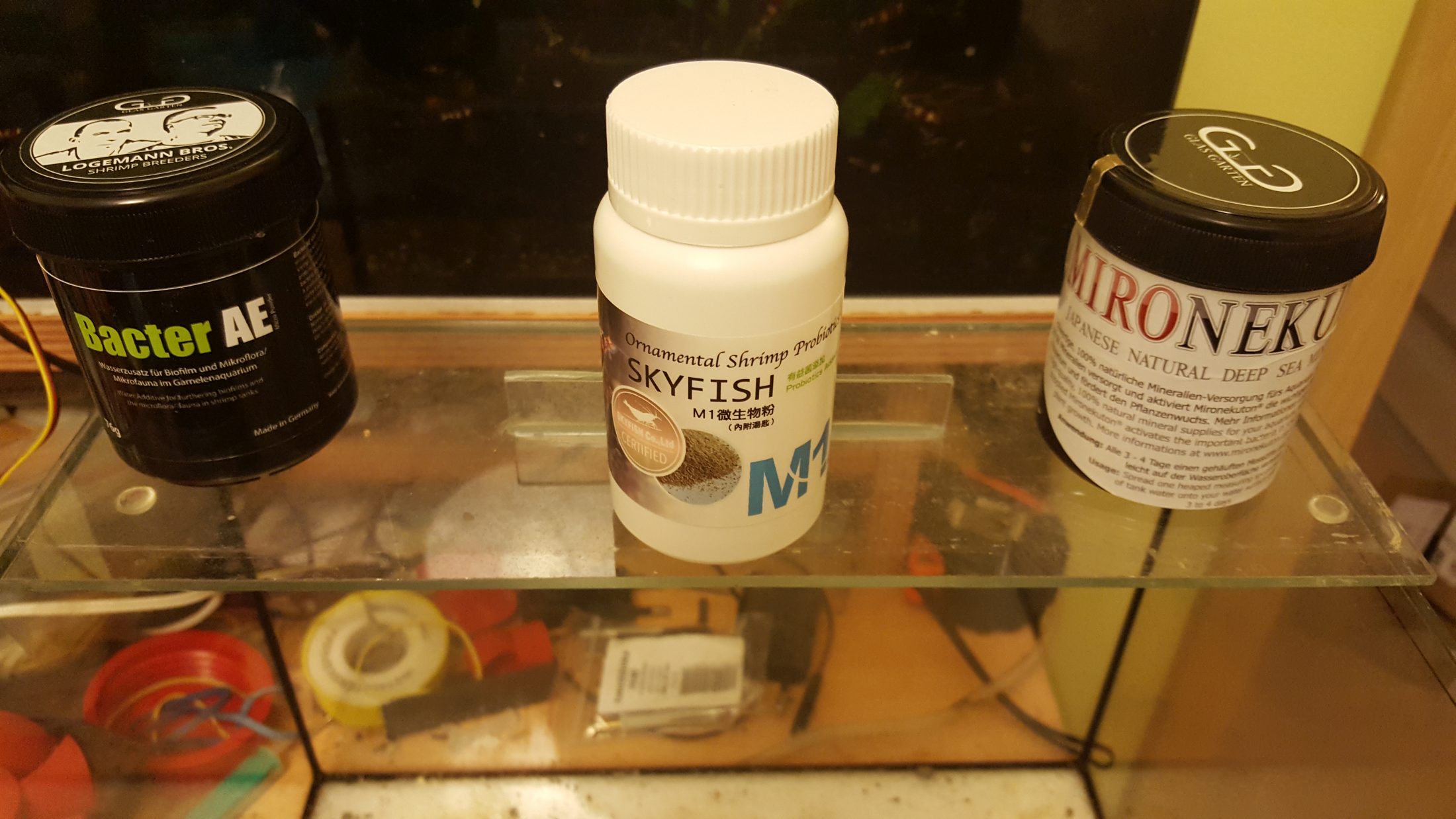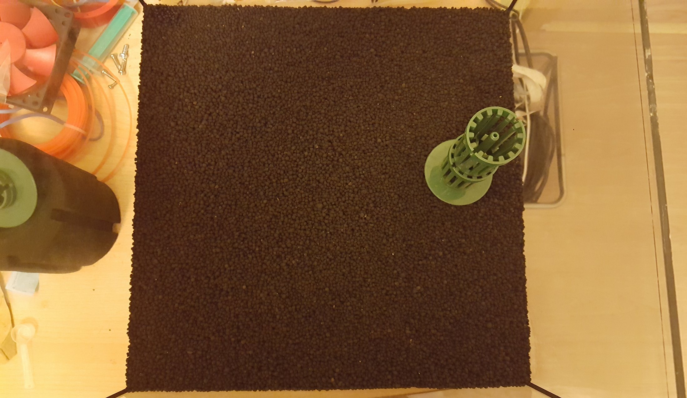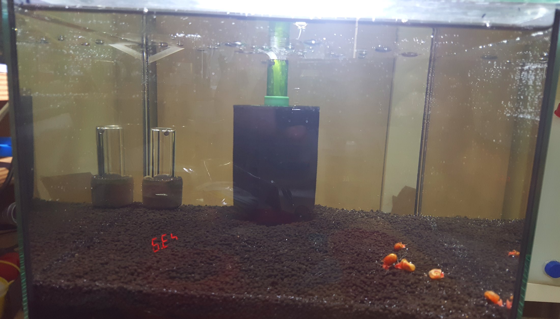 Nová nádrž pre Neocaridiny v práci - 70x30x35. Dno je Rataj Volcano black, voda RO + GH+/KH+. Osvetlenie ledkove z číny 2x 10W filter rohový bublifuk. Ešte musím nalepiť čiernu fóliu na zadnú stenu nech nevidno tú klímu za akvárkom