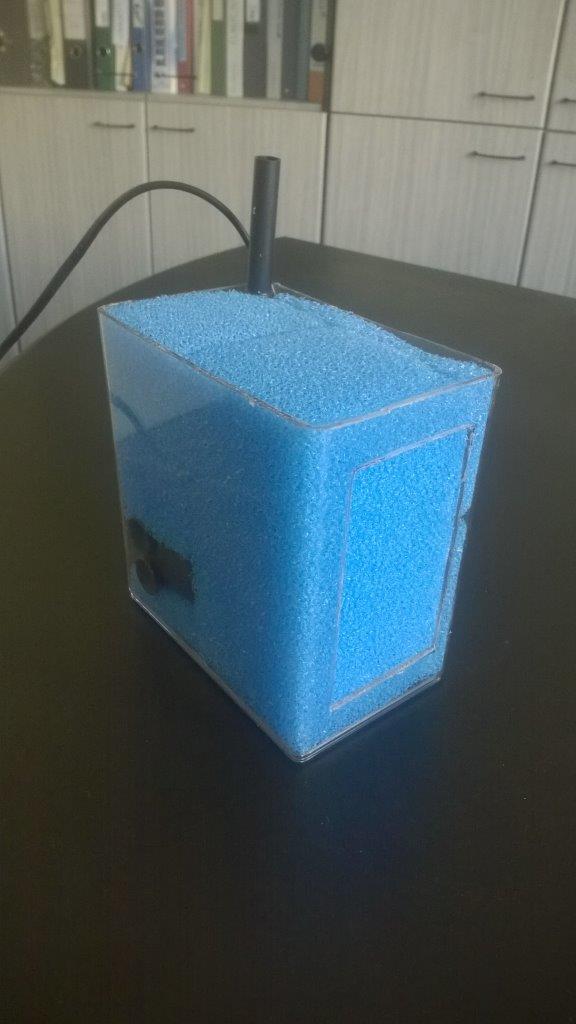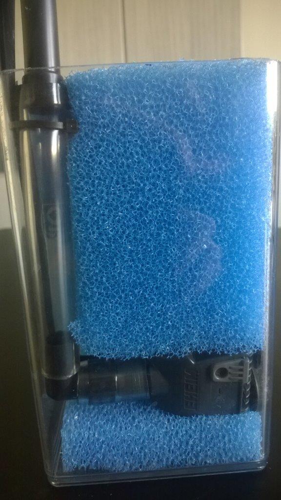 Až teraz som pochopil otázku. Tá sieťka s machom je nalepená iba z tej dlhšej strany a tam kde je otvor v tele filtra sieťka nie je. Filter nasáva z hora a z prava.