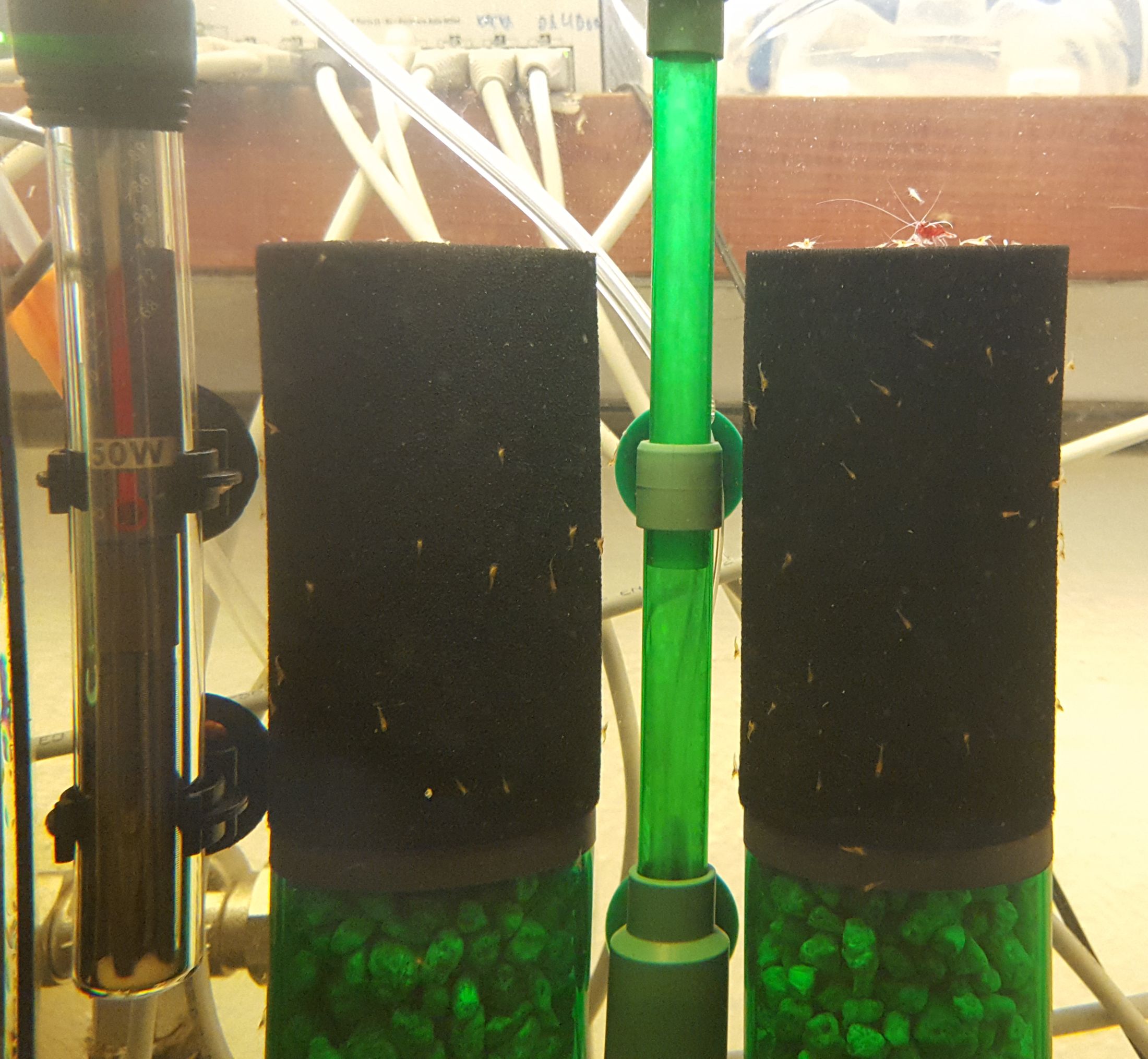 Po zakŕmení práškovou Chlorellou sa idú mladé Sakury potrhať aby ju pozbierali z povrchu filtra: