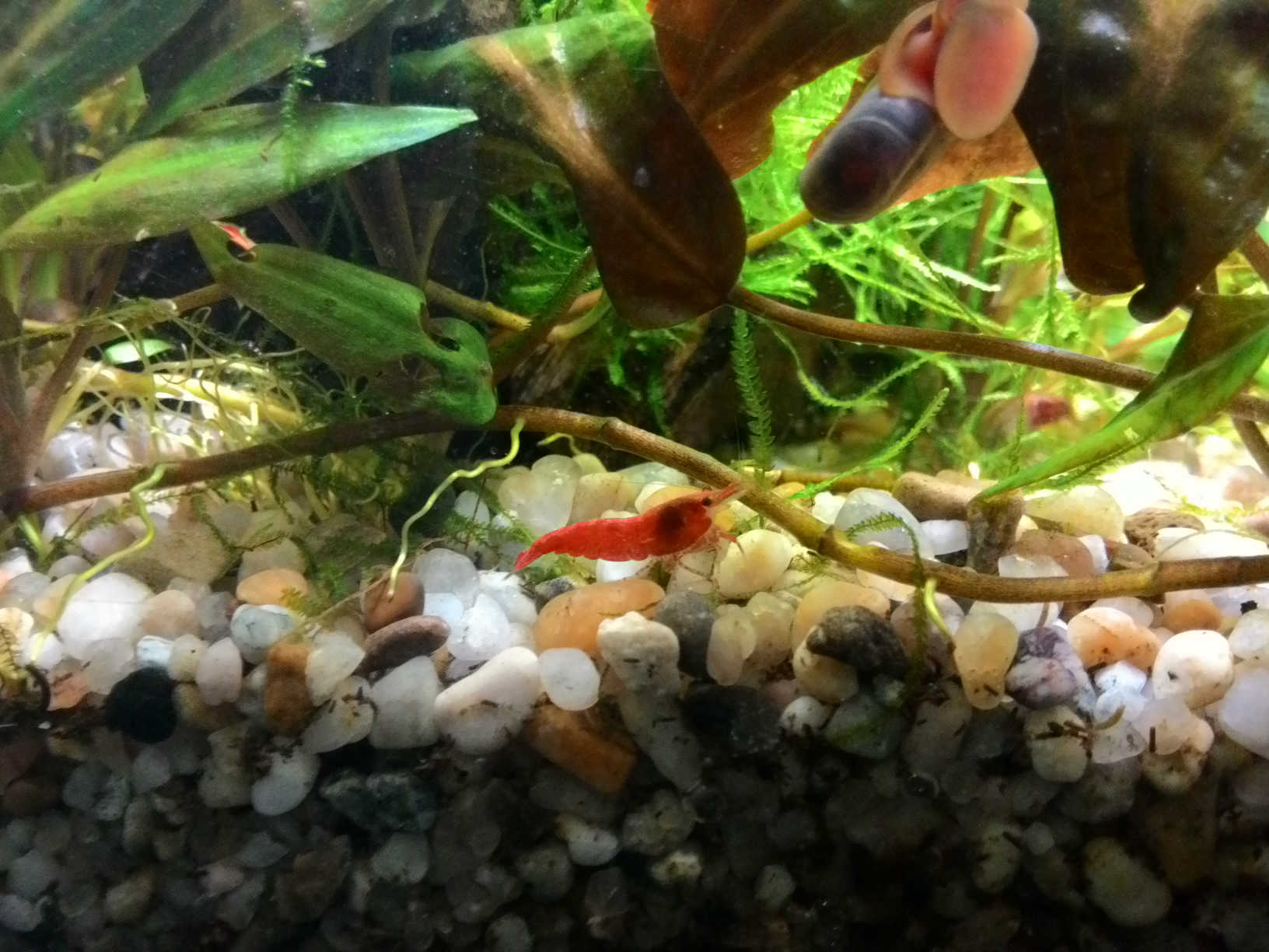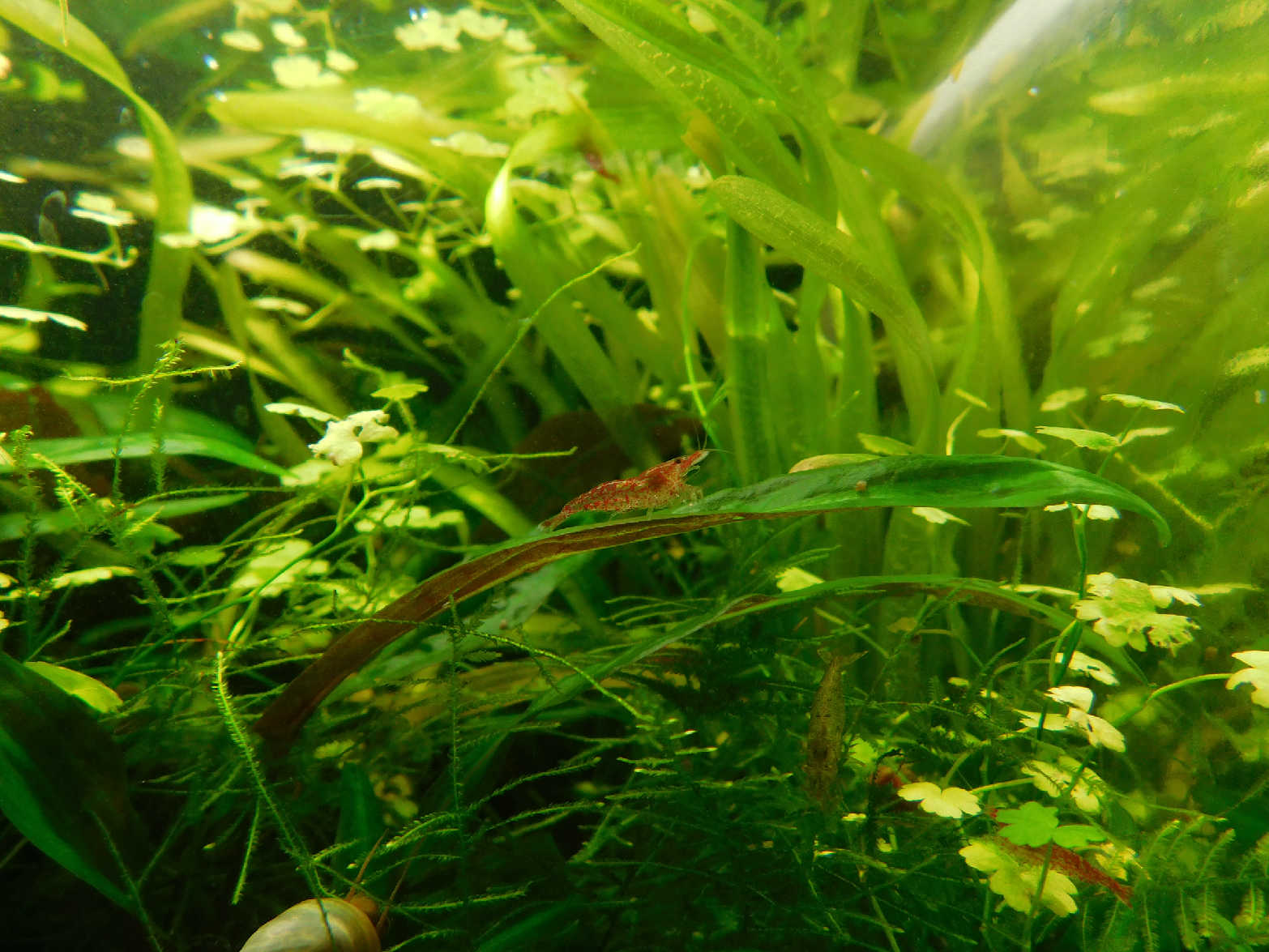 na moje prekvapenie sa vsak predsa len nieco zmenilo (oproti stavu pred mesiacom) - mam minimalne 2 varky mladych ... bola strasne dlha odmlka a je to dost zarastene, avsak dnes pri odkalovani som zbadal, ze som nieco nacucol a nakoniec to bolo 6 mini krevetiek a pri podrobnejsom skumani akva som zistil, ze tam su uz aj pekne cervene mlade