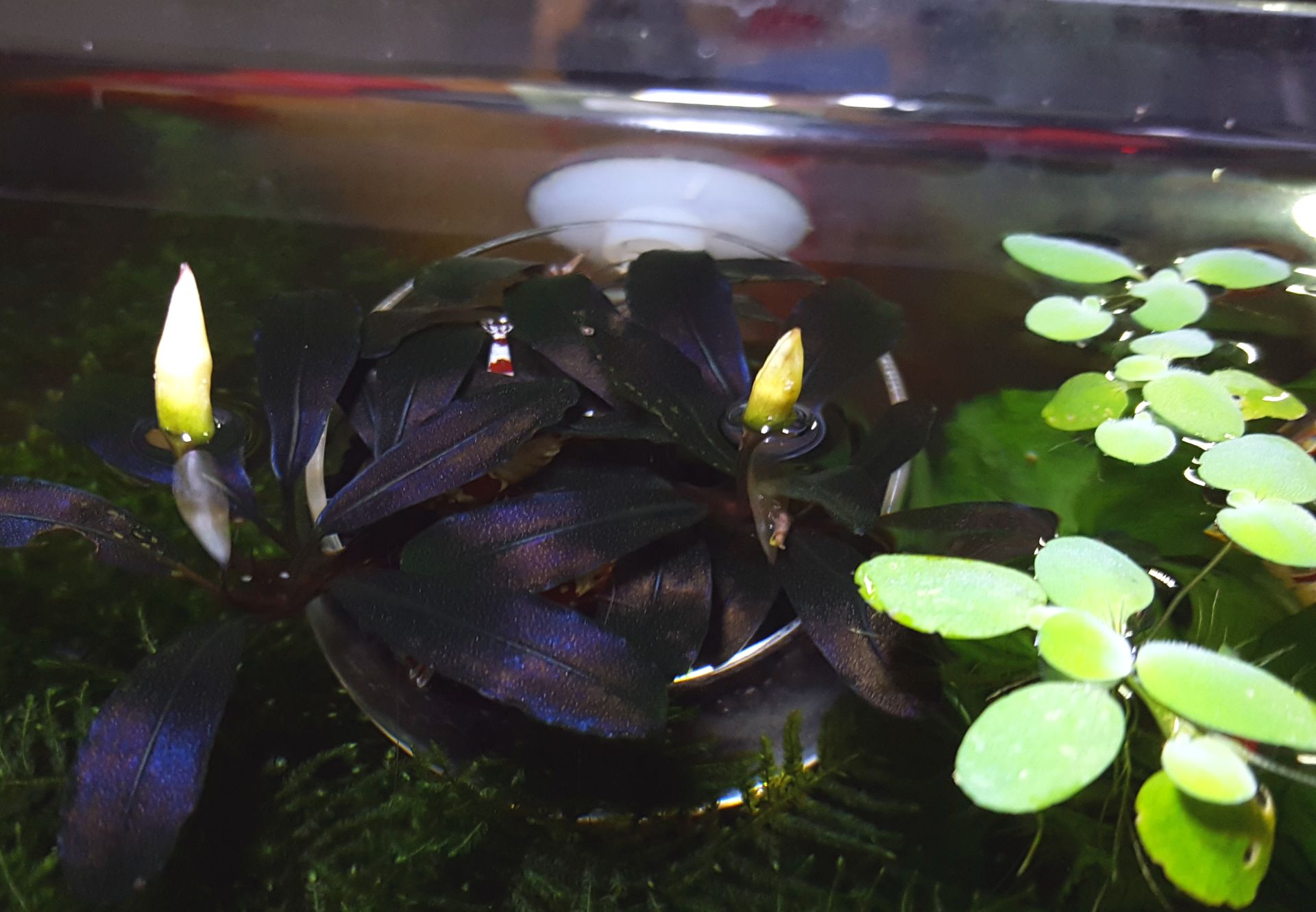 Dve Bucephalandry sa chystajú kvitnúť naraz a nad hladinou. Skúsim ich navzájom opeliť štetcom. Ktovie možno motyka vystrelí.