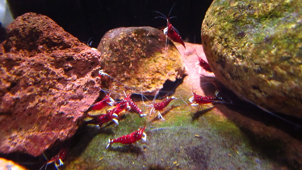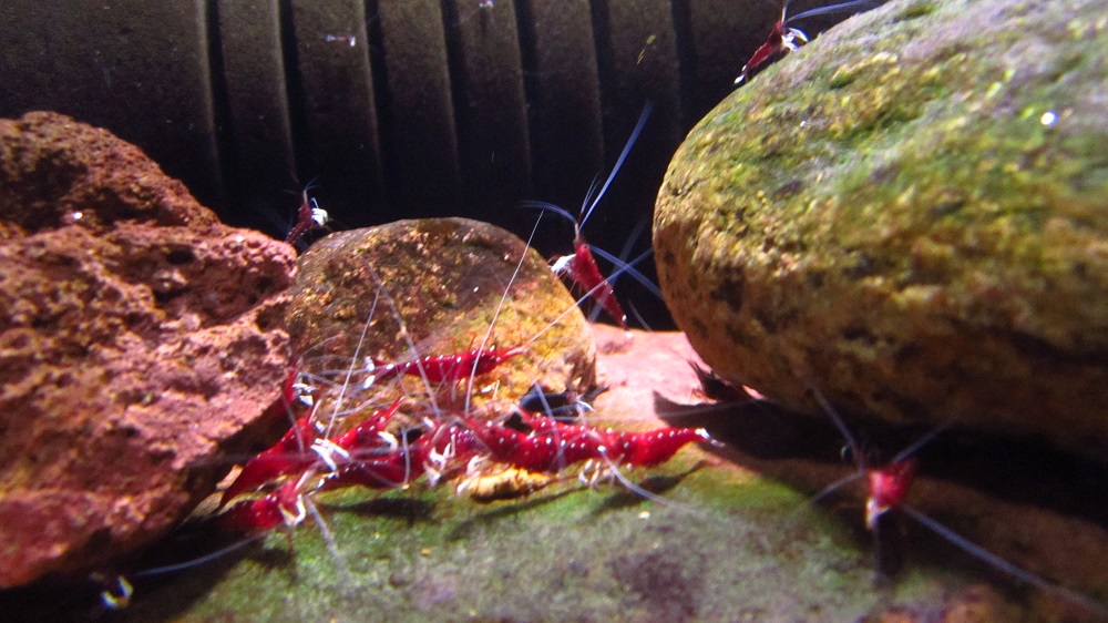 Na obrazku su zoskupene okolo uplne obycajnych Tetra Wafer Mix, krmim tym vsetky moje krevetky uz dlhe roky