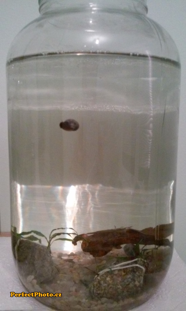 jednej katastrofe som sa vsak uz stihol vyhnut, a to akvarium este nieje ani zalozene ... v 4L pohari, kde si zatial nechavam rast machy co som kupil na burze v decembri, sa mi objavili 2 monstra : lasturnatky (iny druh ako mam v 54ke) a nezmar zeleny :D toho nezmara tam je zrazu tolko, ze sa neda spocitat