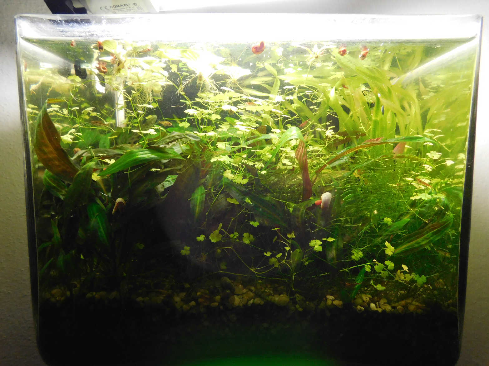 neverili by ste, aka krasna dzungla tu vznikla ... stale bezim bez filtra, s povodnym 11w svetlom, nehnojim, neriesim a zarastol som ako nikdy pricom udrzba je taka nahodna na sposob ked si spomeniem ... jedine pravidelne je krmenie .... 2/3 akva tvori flora, volnych mam asi len 5 cm od vrchu, inak nepriehladna zelen ... krevetky sa stale mnozia, vidim vsak uz dospele divoko sfarbene nosiace samicky, takze sa mi cervena uz dost zopsula a zacina byt v mensine, aj ked este stale nachadzam mlade, nedospele cervene, takze su z novsej varky ... idem to skusit s novym fotakom, ci sa mi nieco podari, aby ste sa mohli pokochat
