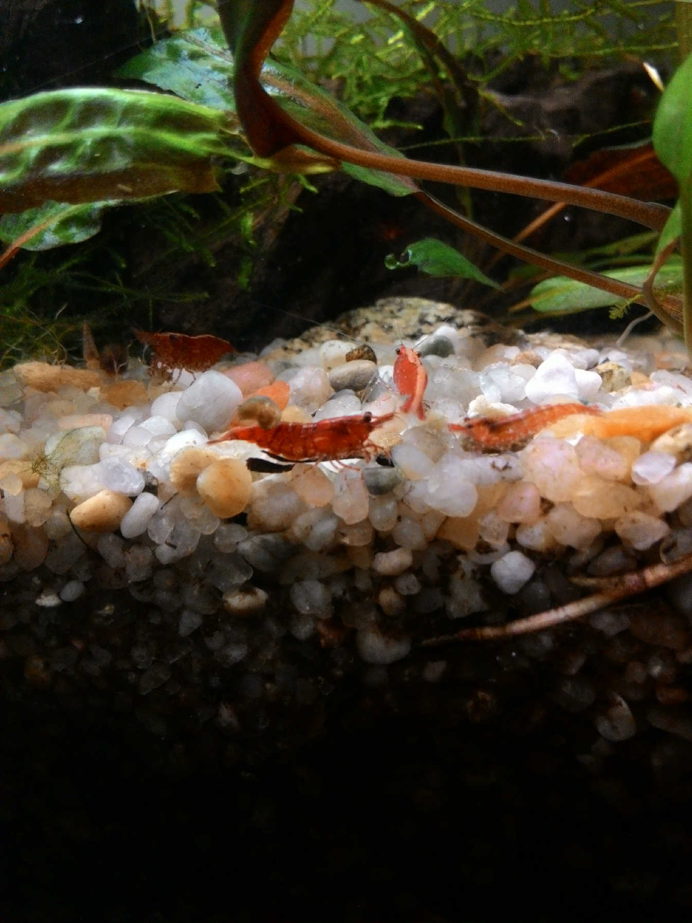 na moje prekvapenie sa vsak predsa len nieco zmenilo (oproti stavu pred mesiacom) - mam minimalne 2 varky mladych ... bola strasne dlha odmlka a je to dost zarastene, avsak dnes pri odkalovani som zbadal, ze som nieco nacucol a nakoniec to bolo 6 mini krevetiek a pri podrobnejsom skumani akva som zistil, ze tam su uz aj pekne cervene mlade