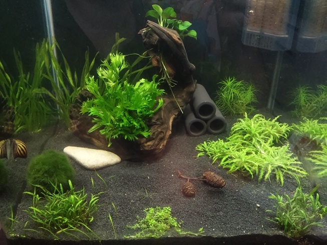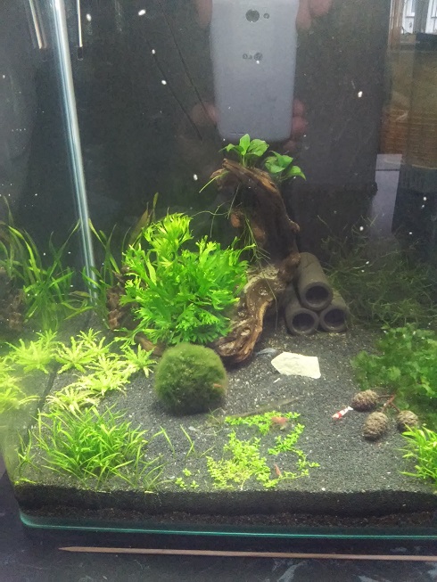 No tak konečne môžem pridať nejaký popis. Prvé akva je krevetkárko, ktoré som kúpil manželke aby v ňom chovala krevetky, avšak sa to nejako zvrtlo... ona chová a ja sa starám =) Ide o set Dennerle o objeme 30l, čistý objem je okolo 25l. V tomto krevetkárku som zaťažený na značku DENNERLE a asi všetko aj rastlinky sú odtiaľ. Filter je Dennerle Nano Eckfilter 10-40l. Je dosť výkonný a dobre sa dá nasmerovať prúdenie kam treba. Spodnú časť filta jedného dňa vymením za filtračný molitan. Substrát zásobný pod čiernym pieskom DENNERLE Nano Garnelenkies Sulawesi Black (nejde o aktívne dno myslím). Dekorácia je koreň z Hornbachu a keramické rúrky, ktoré boli ochotne osídlené pri prvom založení krevetkami.
