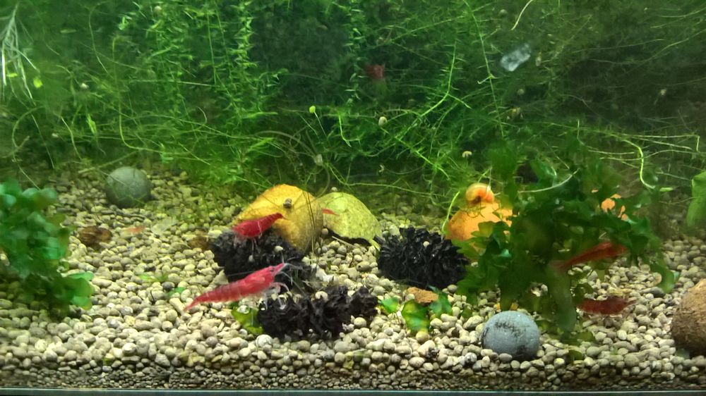 Chovám: Atya gabonensis 2x, Caridina amano 1x, Neocaridina davidi (wild a cherry forma), Neocaridina davidi orange sakura.