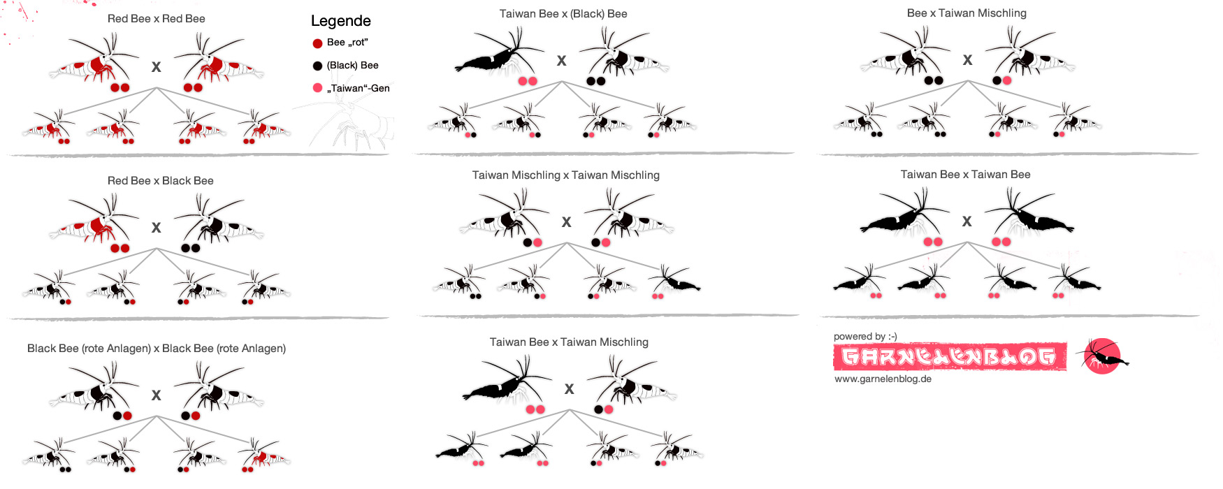 http://www.garnelenblog.de, kde je znazorna dedicnost krevetiek Red Bee (Crystal Red) x Black Bee (Crystal Black) x Taiwan Bee. Opakovanie je matka mudrosti, urcite zaujme aj Milosa, ktory je v tomto doma. Samemu sa mi uspesne potrvrdilo, ze tento obrazok plati. Pre zvacsenie obrazka kliknite nan.