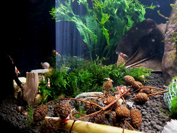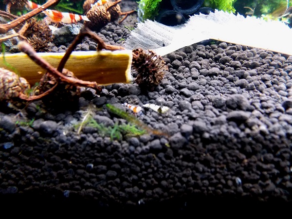 Nedal som vsetko, mi trocha zostalo substratu. Ked ho jeviac lepsie drzi parametre vody a dlksie vydrzi cca 5 cm. Pridal som este korene.