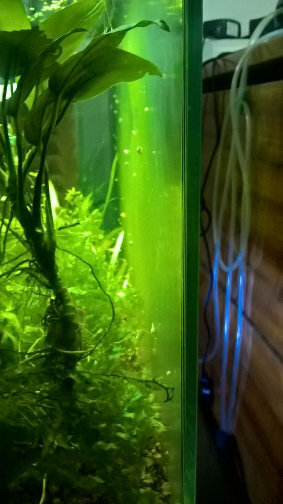Milos: tady to mas z jineho AQ... je to tvrde, prirostle... ty cary jsem se to pokousel nehtem odskrabnout, nejde to, porusis jen povrch --- vzdalene to pripomina rozsivku, ale ta tvori jen tecky, tohle je jednolite... samozrejme cim vice svetla, tim vice to roste, je to zelene, takze nejaka rasa?! sinice?...