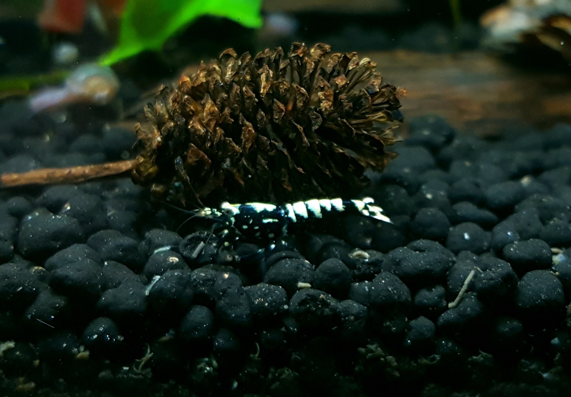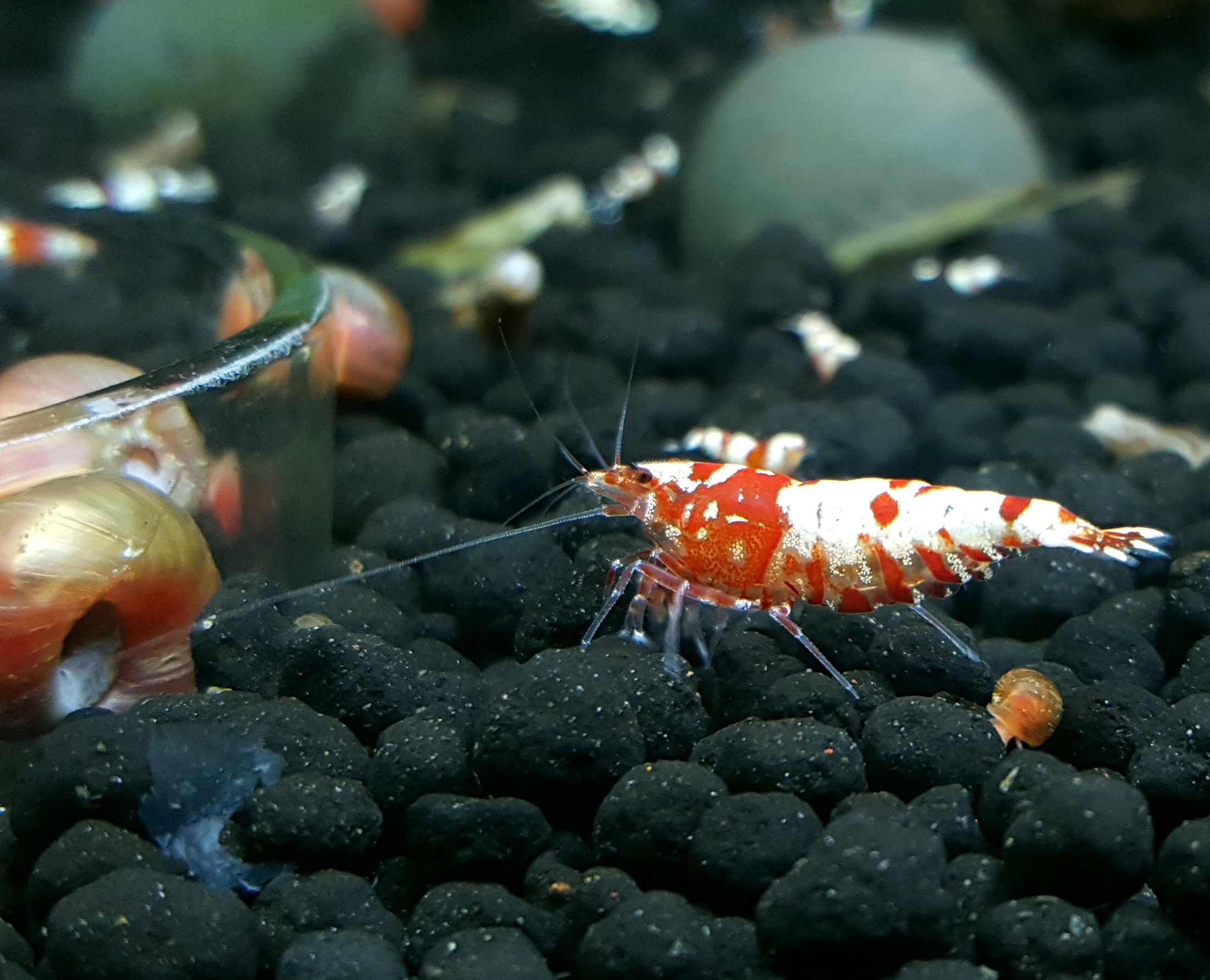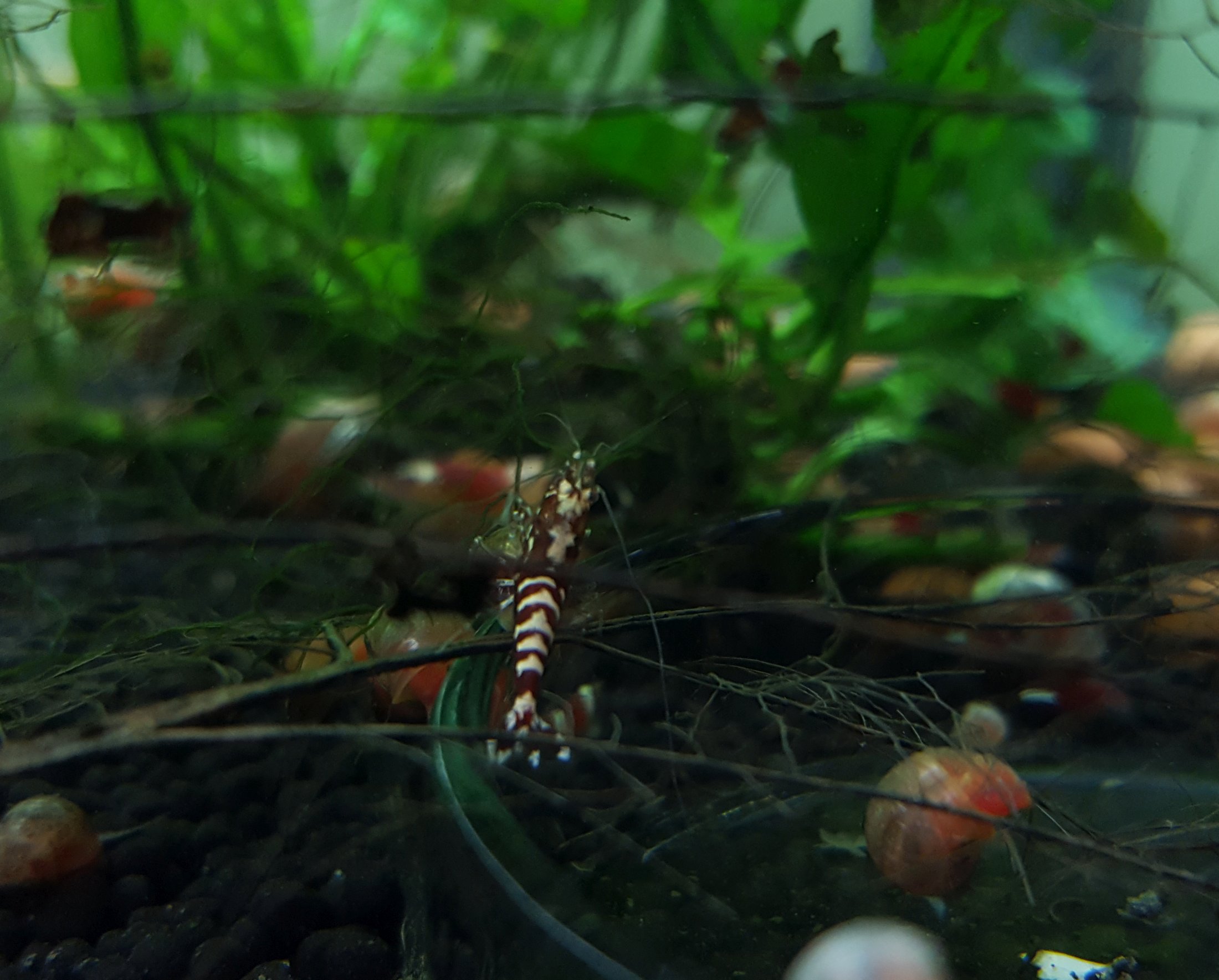 Fancy red/black tiger (TiBee) - kríženec medzi Caridina cantonensis a Caridina mariae môže mať rôzne sfarbenia a vzory