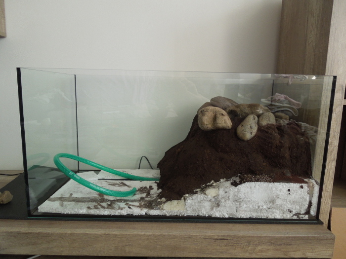 Zrusil som to kvoli jednej veci, ze cely kopec bol jedna velka masa hliny a nedalo sa s tym nic robit, pridavat nejake detaily a kedze som chcel biotop, uvedomil som si ze takato masa hliny bez nicoho v prirode asi nie je, tak som to zrusil a prerobil. Ale efekt stekajucej vody po kamenoch stal za to! Prepacte za kvalitu, fotene mobilom. Cely kopec stal okolo 20€ - PU pena, silikon, hlina. Dost vela na to, ze to skoncilo v kosi. Cerpadlo v kopci, nasavanie v lavom rohu, vyvod nad hladinou.