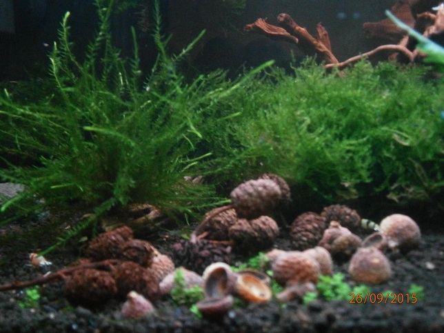 Hodil som do akvárií na skúšku obal z obyčajných lieskových orieškov pred chvíľou. Rovno z kríčka už polovyschnuté a teraz namoknuté po daždi. Už sú na nich neocaridiny i caridiny, zdá sa že ich to zaujalo okamžite.