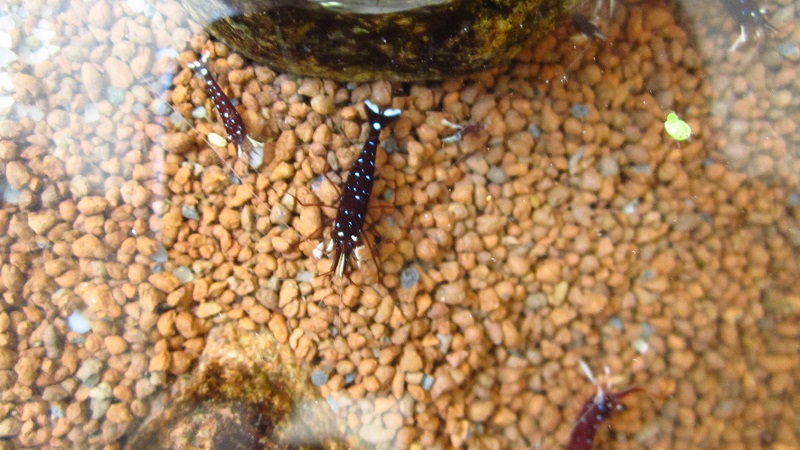 Po 10 dnoch bez svietenia a krmenia zacala posledna z povodnych samiciek nosit a vsetky mlade podrastli. V akvariu to zacina vypadat trocha zivsie, vsade sa mihocu nejake biele klepietka. Bez nejakej vacsej snahy o pocitanie, prehrabavanie sa skalami, sa da v kazdom momente naratat zhruba 20 kusov. Prvy vrh uz pomaly dorasta a myslim, ze onedlho zacnu tiez nosit vajicka.