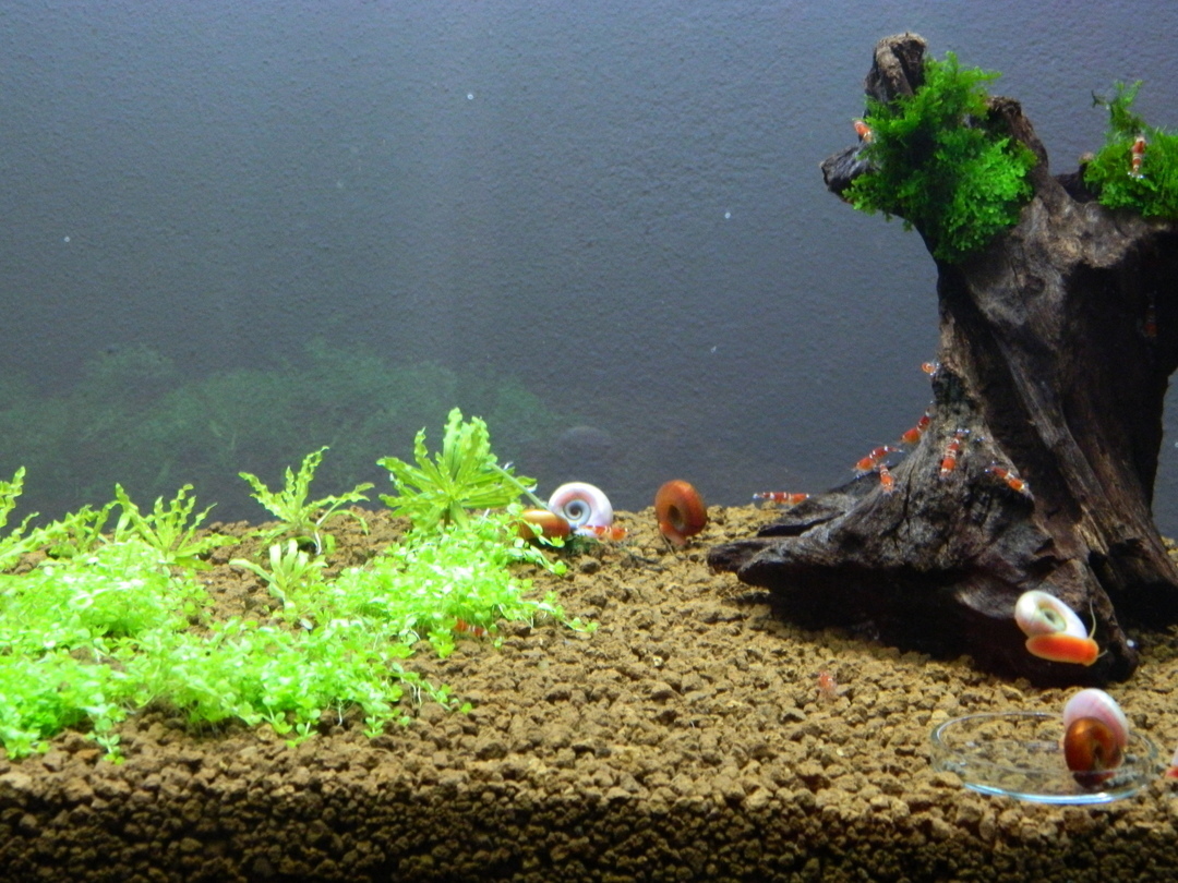 pekne, chyba celkovy pohlad na akva. Pogostemon helferi by som do krevetkarka nedaval, potrebuje hnojit, co2 a dost svela co zase vadi krevetkam.
