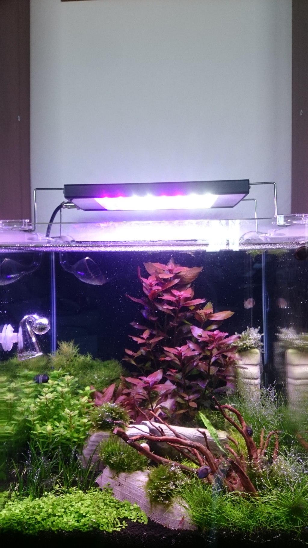Jediný problém spôsobilo zvýšené NO2 ktoré mi na pár dní vybehlo až k dvom mg/l čo spôsobilo rast čiernej vlaknitej riasy najvýraznejšie na dreve a na rastlinke Littorela uniflora v menšej miere v niektorých machoch ale stále to nieje nič kritické dúfam že sa riasu podarí udržať na uzde obzvláŠt keď dnešné merania ukázali že NO2 je už OK NO 3 má tiež klesajúcu tendenciu.