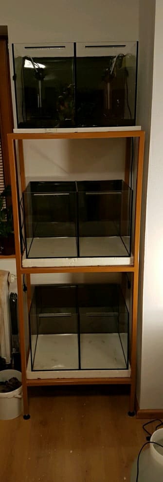 Aby som dodal väčšie akváriá na komode 3x72l, menšie akváriá v stojane 6x 36l a malé NANO 15l všetko čistého objemu. Voda z RO+ minerály GH+ a pre neocaridiny naša z vodovodu, hodnoty nepoznám ale vždy sa im v nej darilo