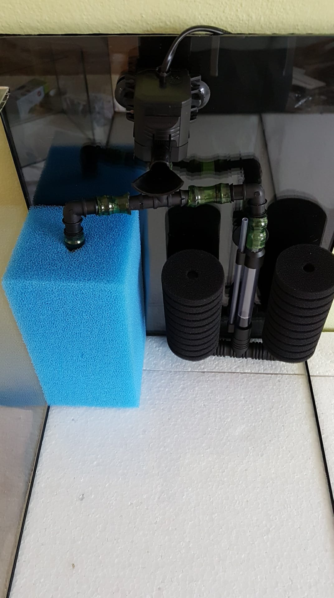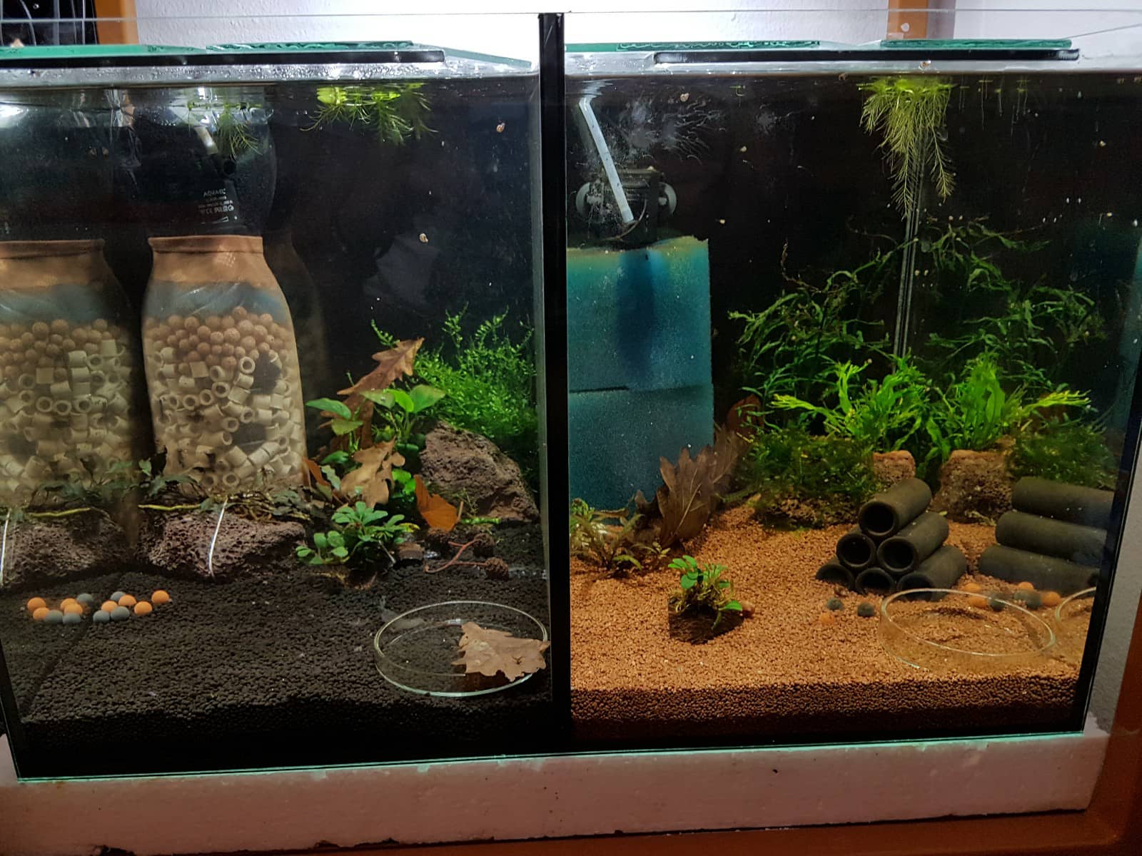 Filtre sú čerpacie hlavice Aquael Pat mini na molitánových kockách a bublifukoch iba jeden mám taký homemade filter z plastovej flaše.
