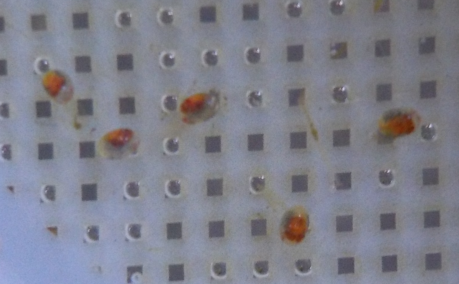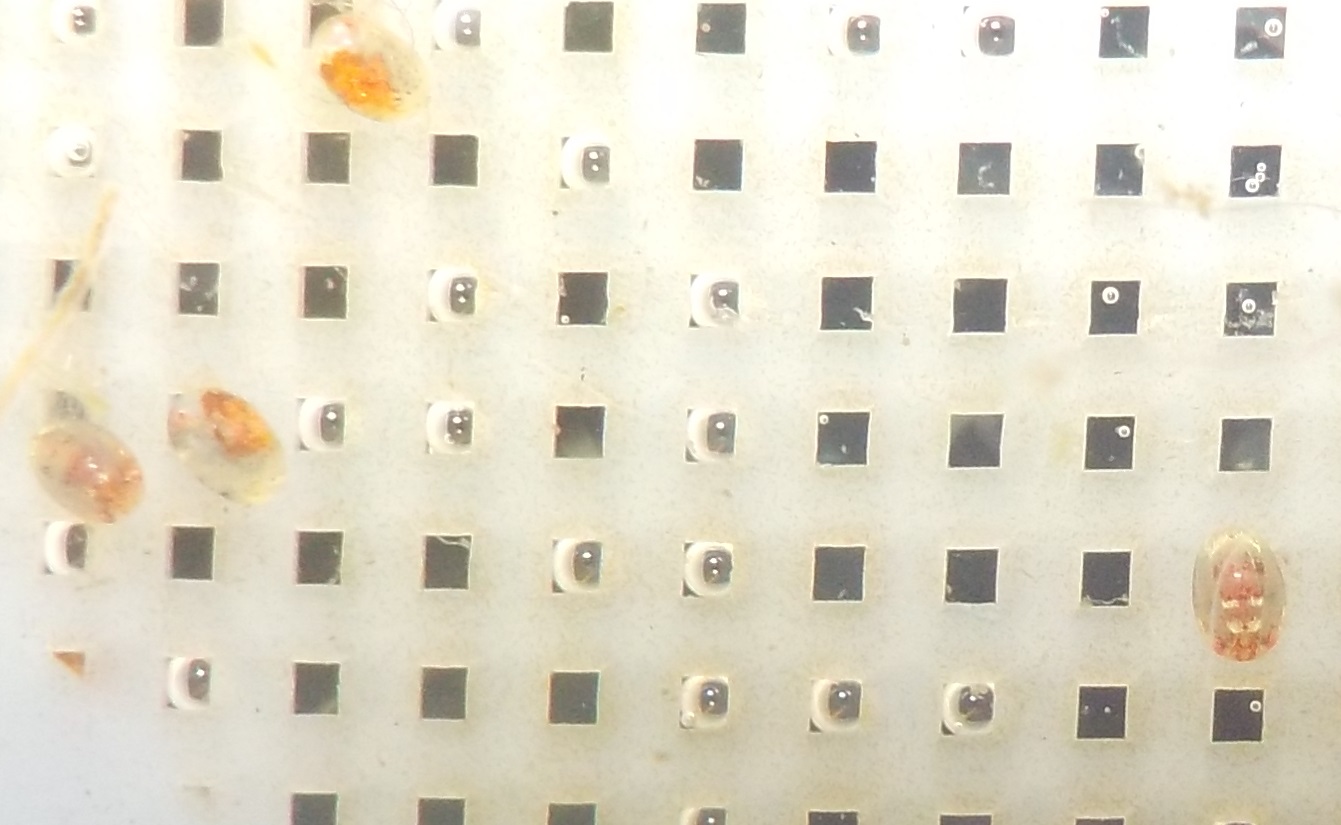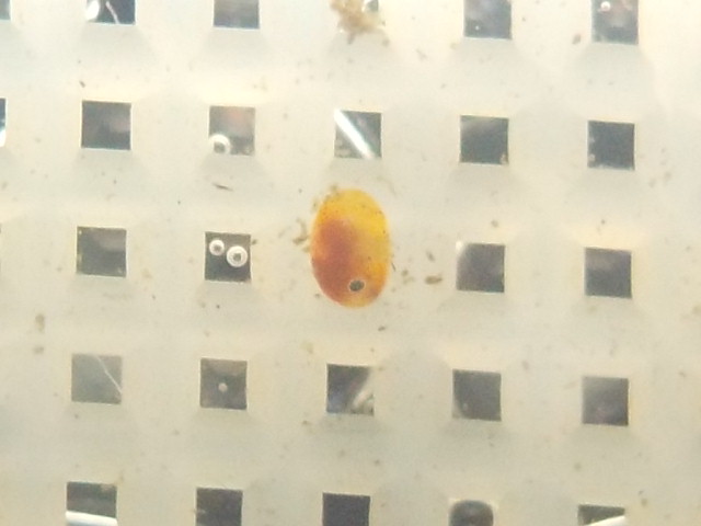 Ahoj, keď moja najkrajšia mosura nosila 2 týždne a začala polihovať tak som tušil, že to nedopadne dobre. Samicu som odlovil do sieťky a za pár hodín bola K.O. mala len 6 vajíčok, tie som odobral a vložil do tejto sieťky a nasmeroval na ne filter.. dnes som sa ich pokúsil odfotiť a na vajíčkach som objavil po 2 čierne bodky, sú to oči kreveťátok?