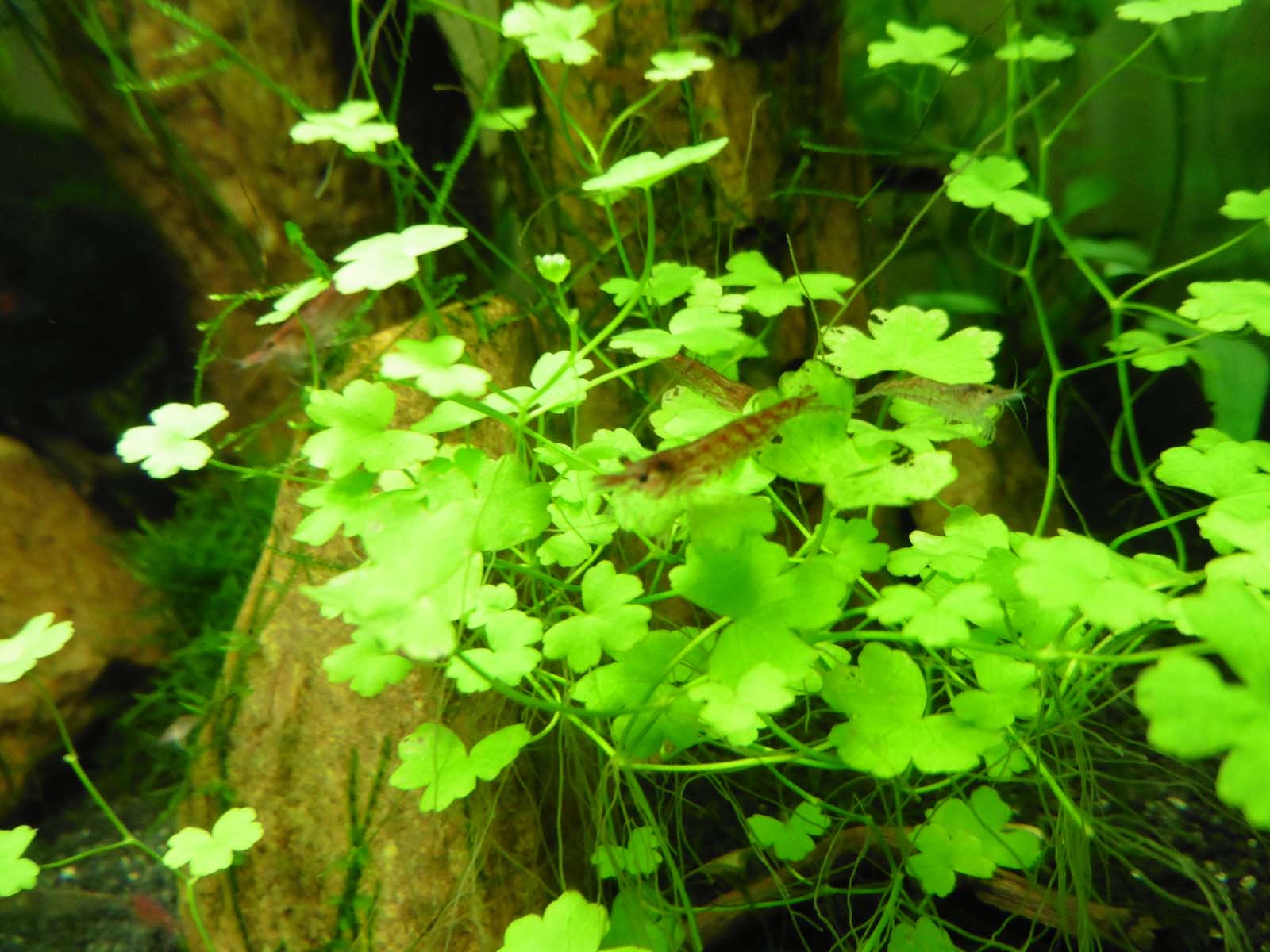 Ako nenáročnú rastlinku do kreevetkária doporučujem z vlastnej skúsenosti Hydrocotyle tripartita (drobné listy, vzdušné korienky, krevetky sa v nej radi prehrabujú a schovávajú).
