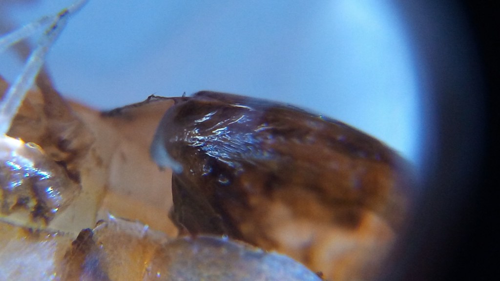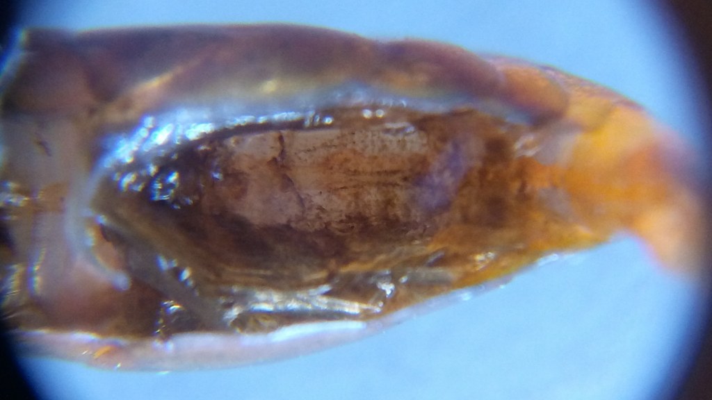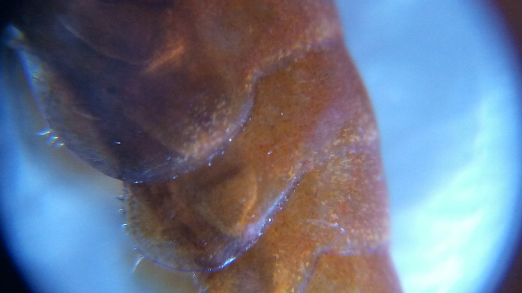 Takze sme o krok vpred, krevetky dva napadnute exemplare som hodil pod mikroskop a takto to vyzera. cize ziadne vajicka nemaju, vyzera to na prvy pohlad ako nekroza, ale bude to niecim napadnute... Krevetka vyzera vlastne ako keby nosila velmi tmave vajcia, chovanie viac menej bez pozoruhodnosti, ale to sfarbenie spodnej casti brucha a pri ustnom otvore bije do oci, je to vyrazne. Tazko byt teraz mudry