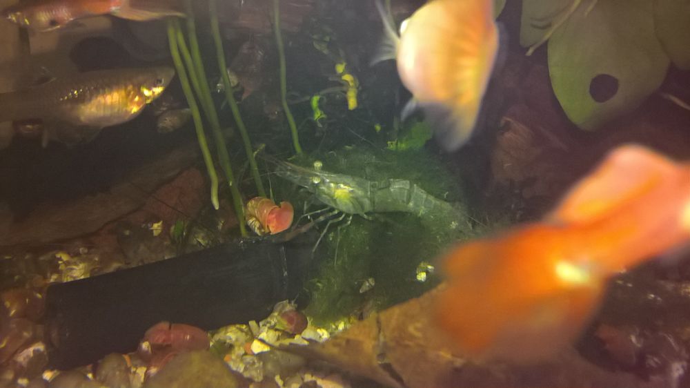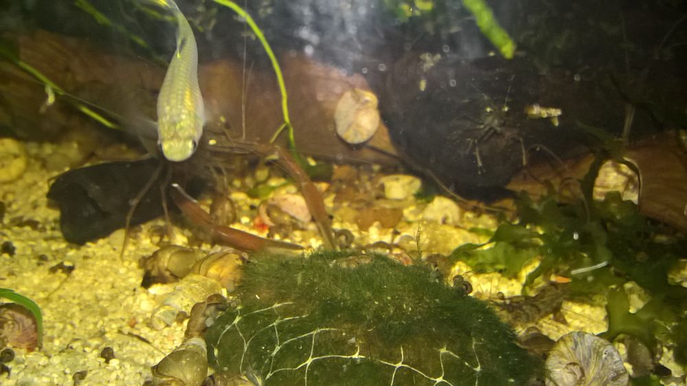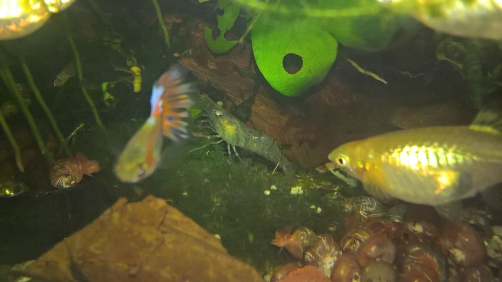 tak i presto, ze AQ je plne agresivnich a vecne hladovych gupek a zacinal jsem s kombinaci 1samice + 4samci, zacinaji z dzungle vylezat prvni krevetky o velikosti +2cm.. do ted nebyly vubec videt... jinak ta velikost je opravdu impozantni, narocnost nijak velka... prozatim uhynul jen dominantni samec pri havarce v AQ - klasika zdechla gupka v dzungli...