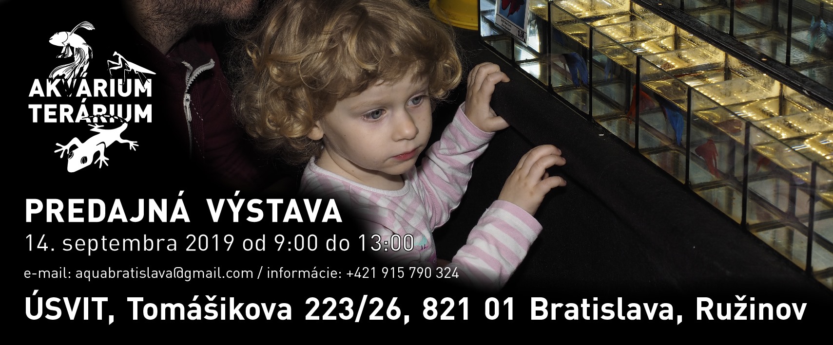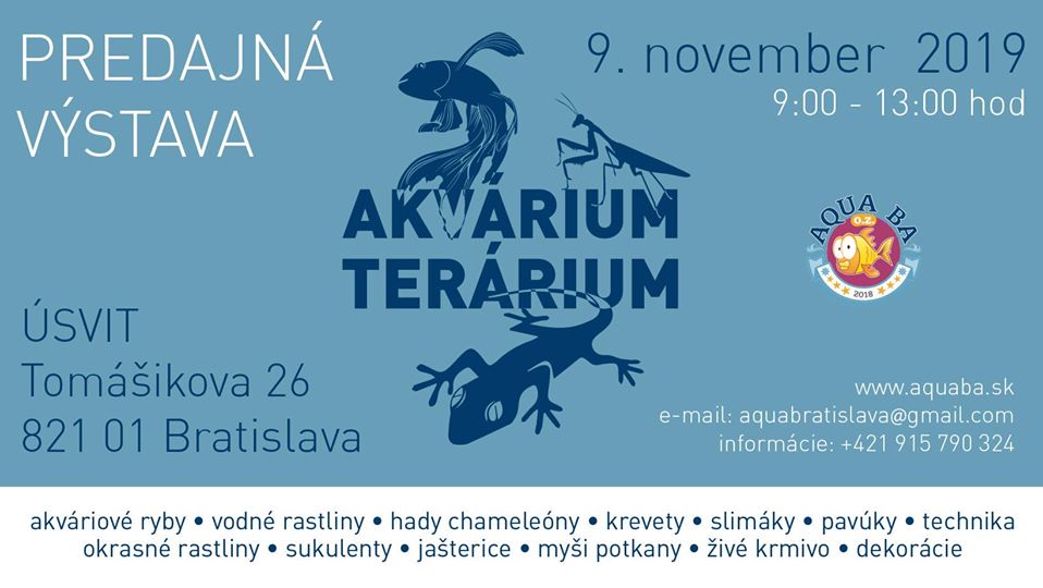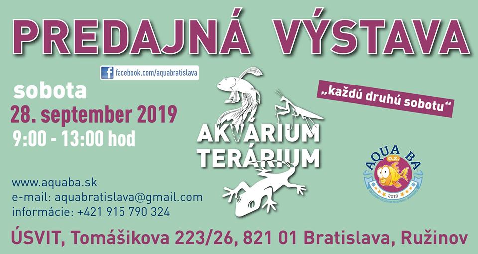 Ahojte. Opat ako kazde dva tyzdne sa kona dna 11.5.2019 akva vystava v Bratislave - budova Usvit, ul. Tomasikova 26, od 9-13hod. - mozete si rezervovat predom zivocichy.